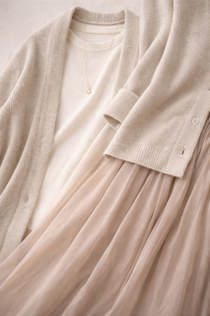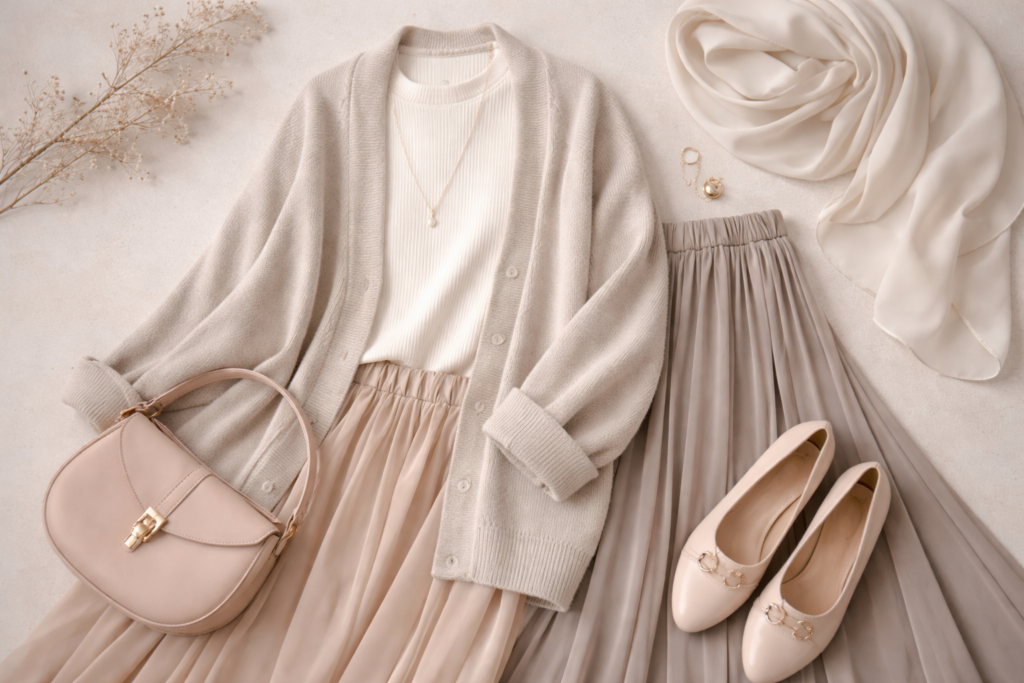 Finally, color harmony keeps layered outfits from looking busy. Staying within a soft tonal range — creams, taupes, muted greys, dusty pinks — allows texture to stand out instead of clashing.